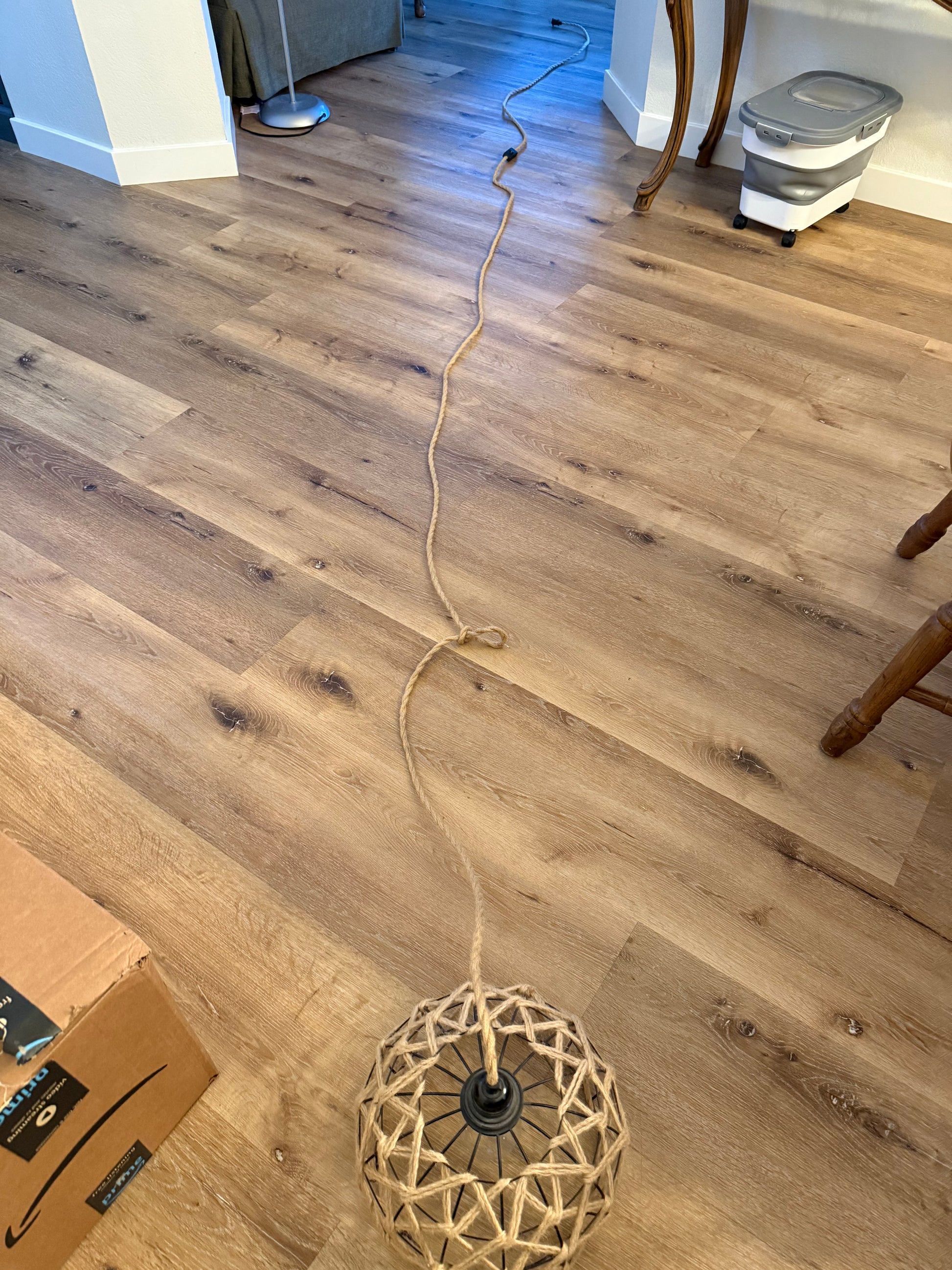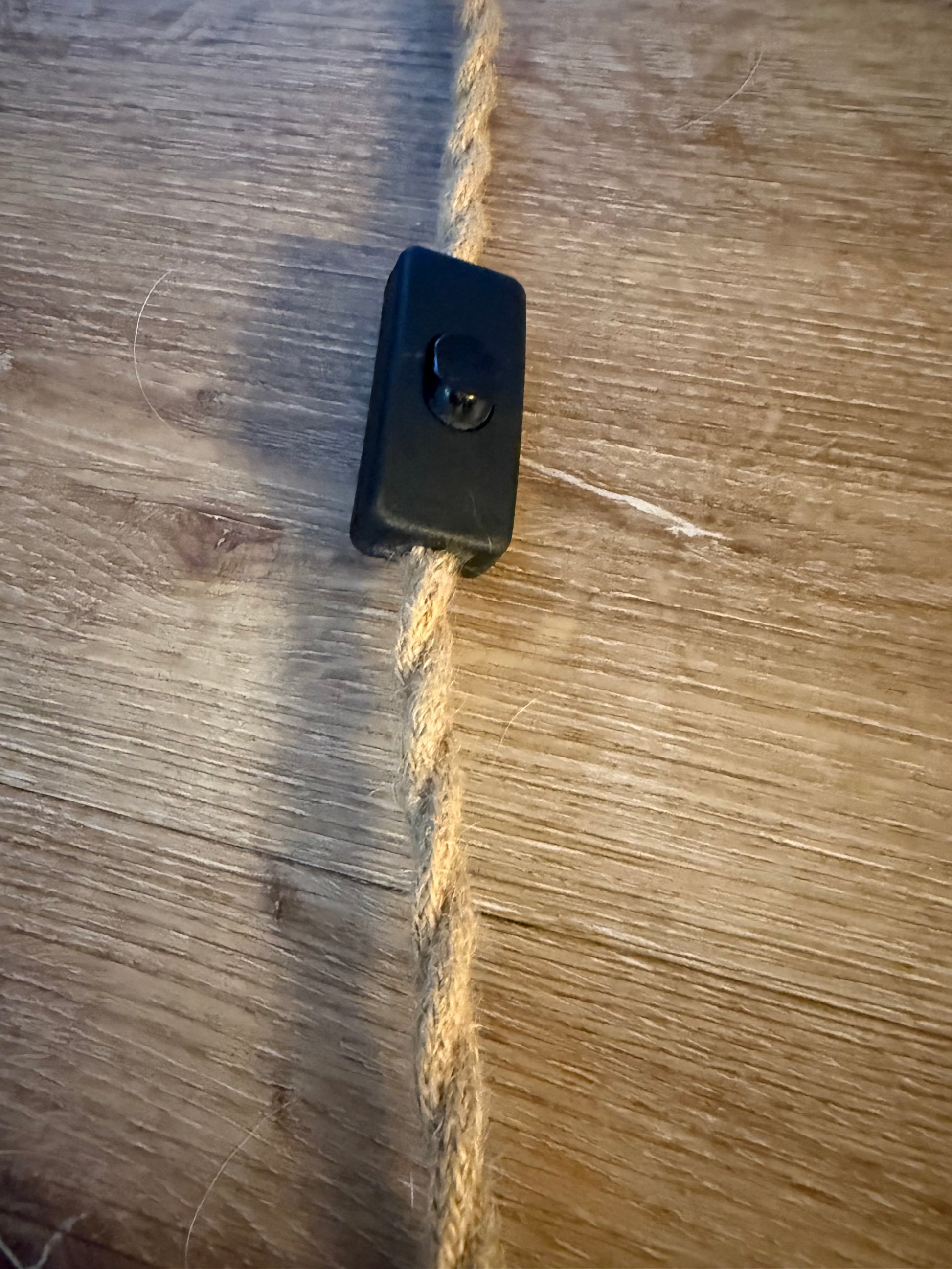 This pendant light has a 15 ft cord which allows for hanging from the ceiling running the cord over to a hook then down the wall to an outlet. (That is how we had it set up) There is an on/off switch. Nice ambient lighting for a bedroom, office, reading area, etc.