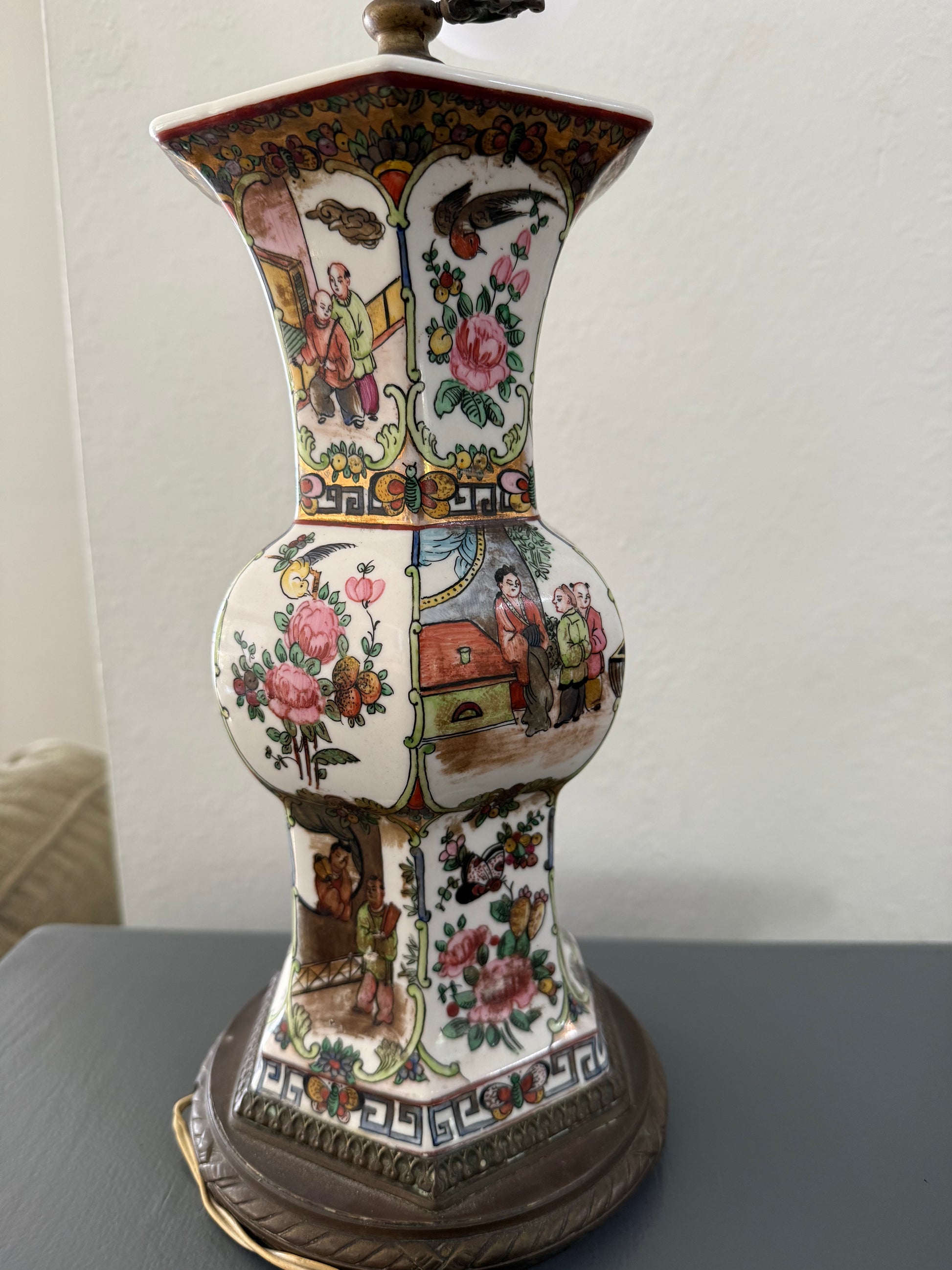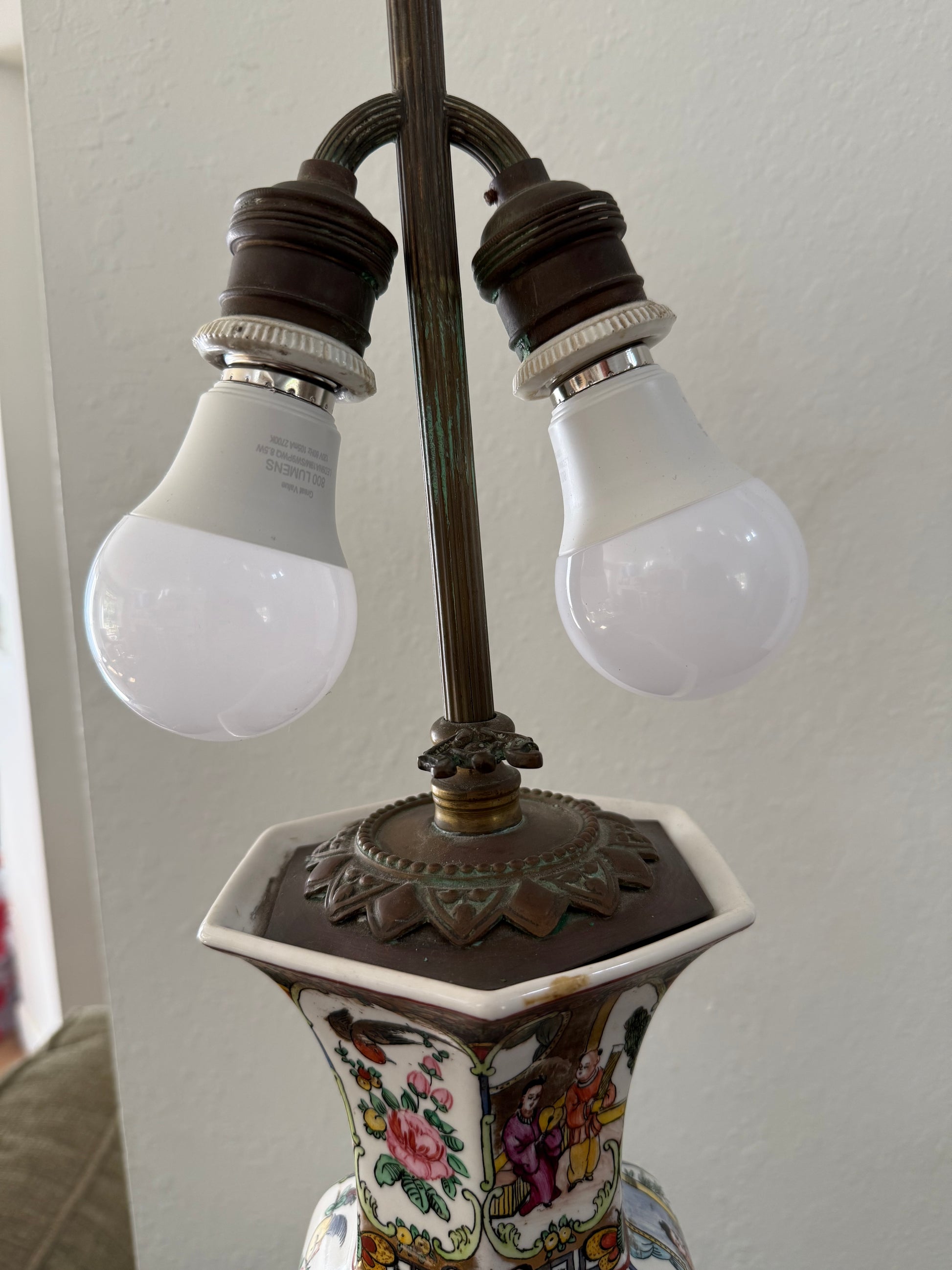 This is a rare 18th or early 19th century Qing Chinese Famille Rose Gu Vase converted into a dual socket lamp. This vase was imported to Buenos Aires in the early 20th century where it was converted into a lamp. The cord still has a Type C plug, common in Buenos Aires, but I have a convertor so I could confirm it is working. Beautiful lamp with artwork on every side.