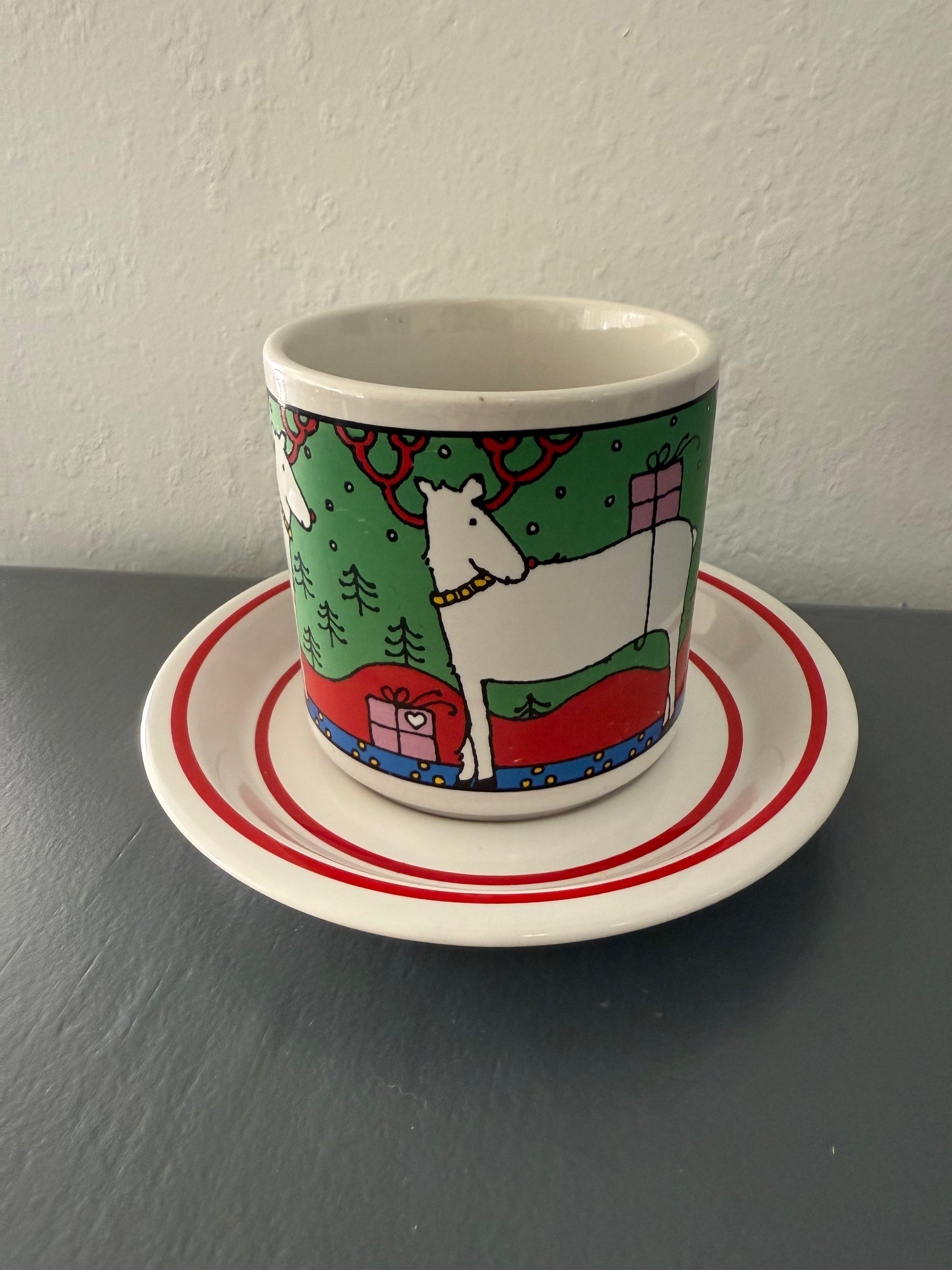 Alan Wood was an artist known for his whimsical and colorful designs in the 1980s. This Houze mug is sitting on an Epoch "Twas The Night Before Christmas" saucer.